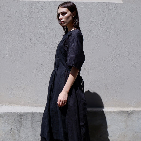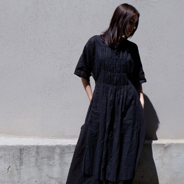 The Fronce Dress is crafted from a soft, breathable cotton gauze and cotton-linen blend, offering both comfort and natural texture. Its front shirring pleated detail adds subtle structure and an artisanal touch, creating gentle volume and movement throughout the silhouette. Featuring a relaxed fit with a mid-length hem and half sleeves, this dress balances ease and sophistication.