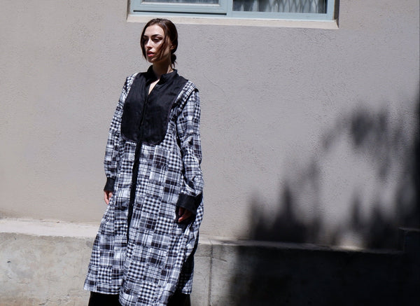 The Noir Et Blanc Patchwork Dress is crafted from a breathable cotton-linen blend, featuring a black patchwork design in a monochrome palette. A soft, structured silhouette is accented by a black front bib with a clean binding finish. Designed for versatility, it can be worn open as a lightweight layer or closed as a statement dress. Effortlessly combining form and function, this piece offers modern minimalism with subtle texture.