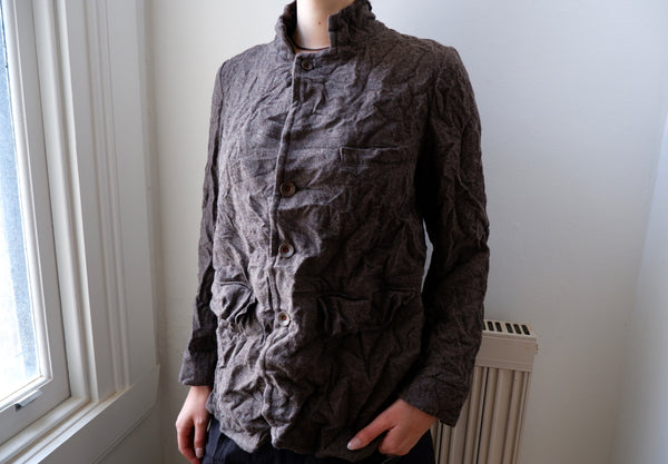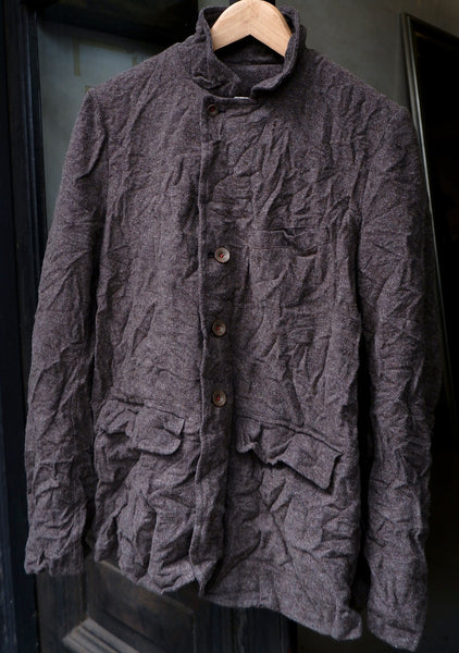 Taking inspiration from 19th century workwear and mens tailoring, subverting it to create a unique design, the La Ferme Crinkle Jacket is constructed using a Japanese wool and is cotton lined. The jacket's unique construction feautres a high collar when fastened or a classicly flat open lapel, round-edged front panels finished with two generous pockets, a smaller breat pocket and a subtle bottom-back slit.