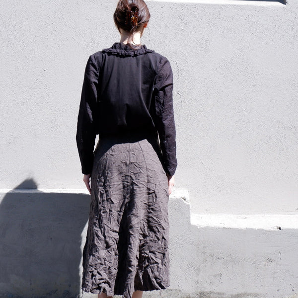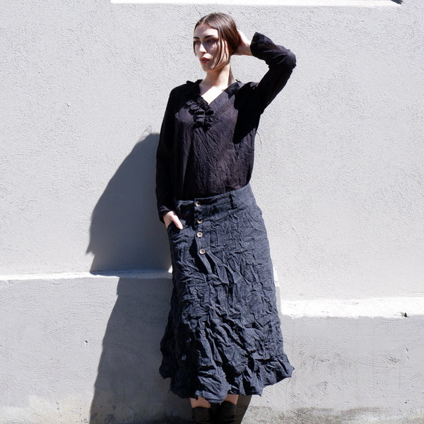 The Lenglen Skirt is an E.S.S Laboratory staple, both classical and timeless at the same time. Featuring a distinctive curved button wrap with metal buttons, a-line silhouette and asymmetrical panel. Fully lined with side pockets.