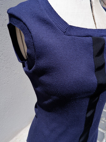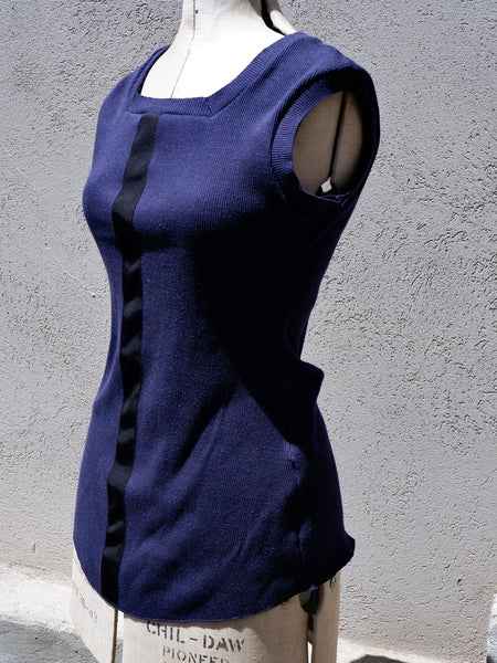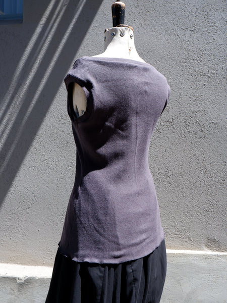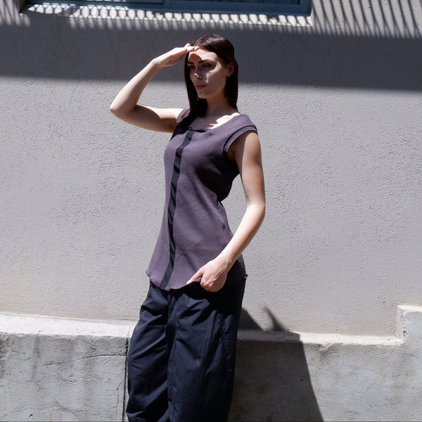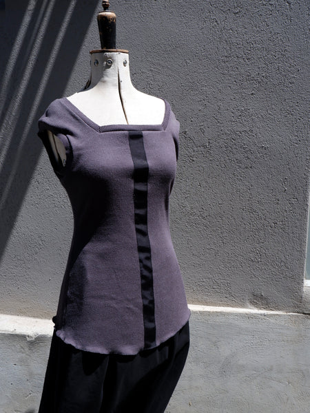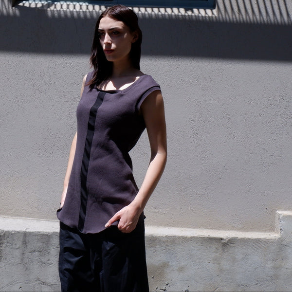 Unisex singlet in soft Japanese cotton jersey with a raw edged square neckline and sleeves, fitted silhouette, tape along the front seam and a baby locked hem.