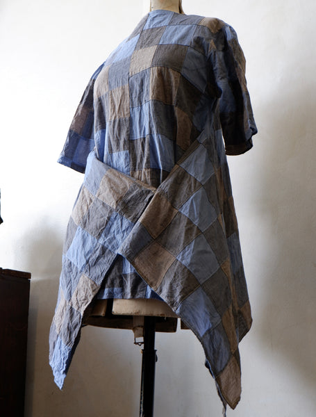 An iteration of the E.S.S Laboratory classic, the Patchwork Wattle Shirt is made from 100% Japanese cotton. This collarless shirt has raw edges and an exaggerated draped hem, creating a beautiful A-line shape.