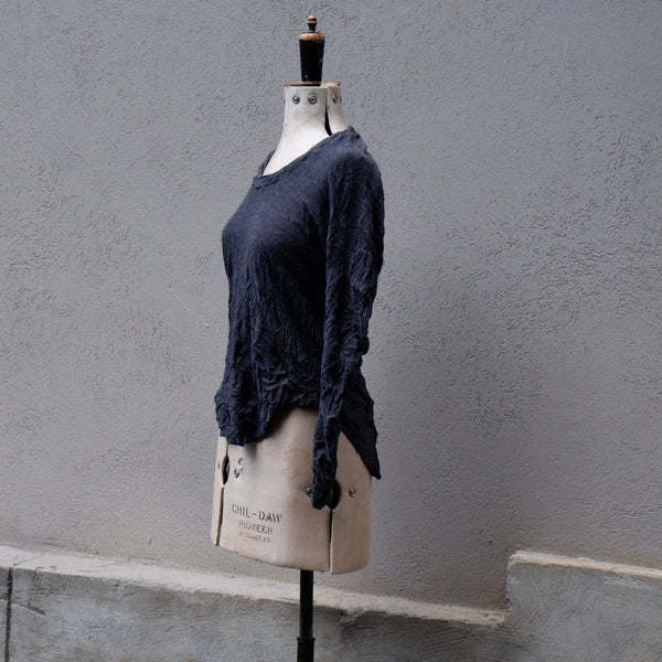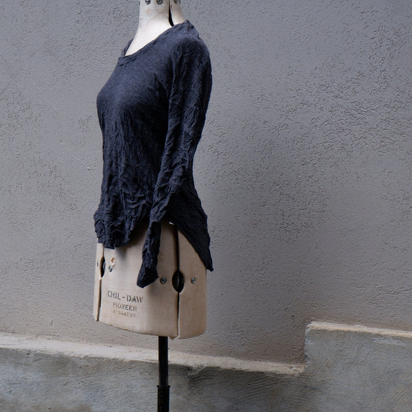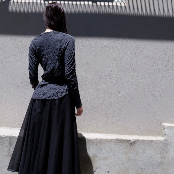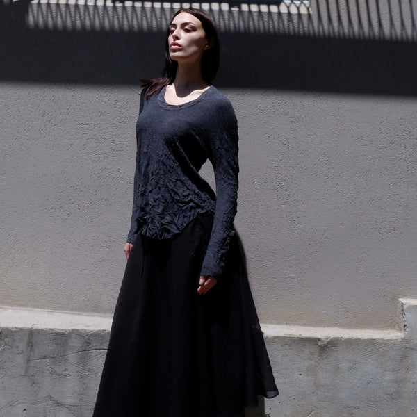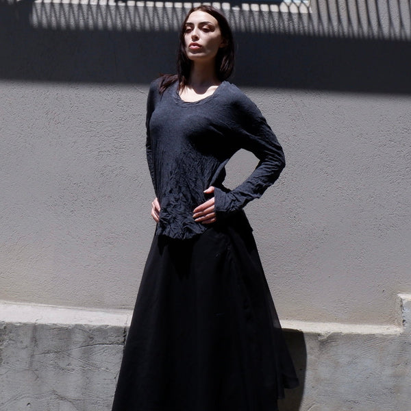The Wool Circle Top is constructed using a soft Japanese wool and elastane blend featuring a round cut from neck to sleeve, continuous along the bottom hem, a twisted neck band and princess seams along the back for a curved fitted piece beautiful for layering.