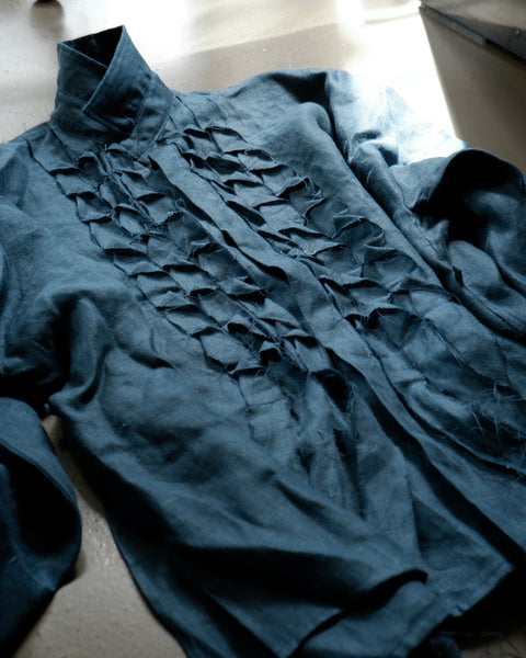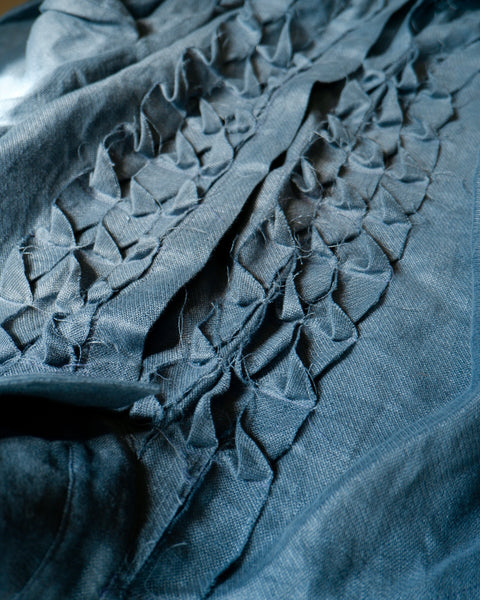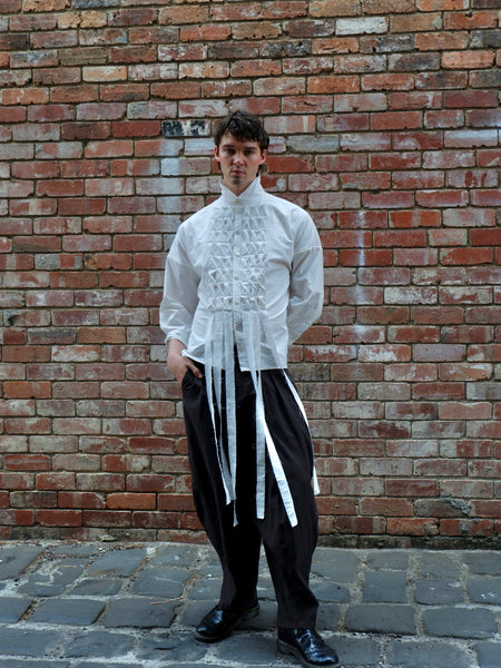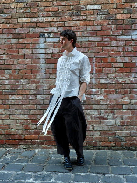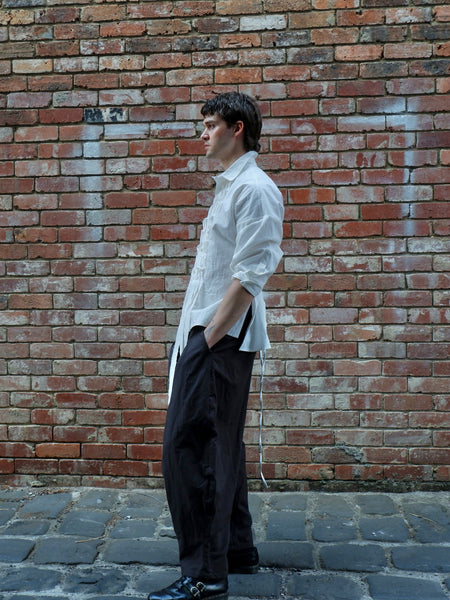 Made from a lightweight 100% wool gauze, the Chaine Sac Shirt is an iteration of the ESS staple Boxy Shirt including a twisted band detailing down the front of the garment adjacent to the button up placket. The garment features an adjustable waist tie worn loose for a boxy relaxed fit or fastened for a fitted silhouette, a classic collar and button up sleeves.
