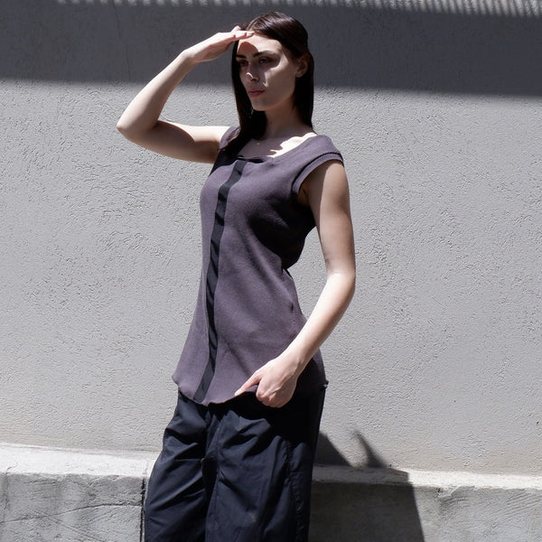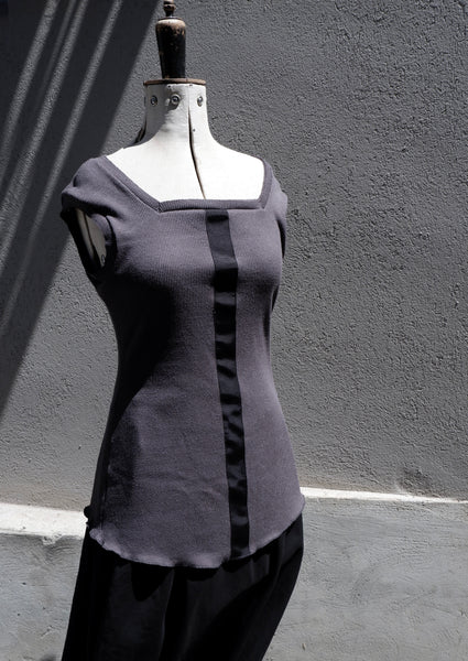 Unisex singlet in soft Japanese cotton jersey with a raw edged square neckline and sleeves, fitted silhouette, tape along the front seam and a baby locked hem.