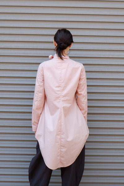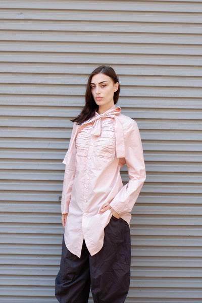 The Gathered Bib Shirt is made from a luxurious semi sheer cotton/silk blend with an intricate gathered bib section on the front. This romantic shirt is beautifully tailored following the curves of the body. With an elongated curved hem and soft neck tie, this shirt is perfect for layering.