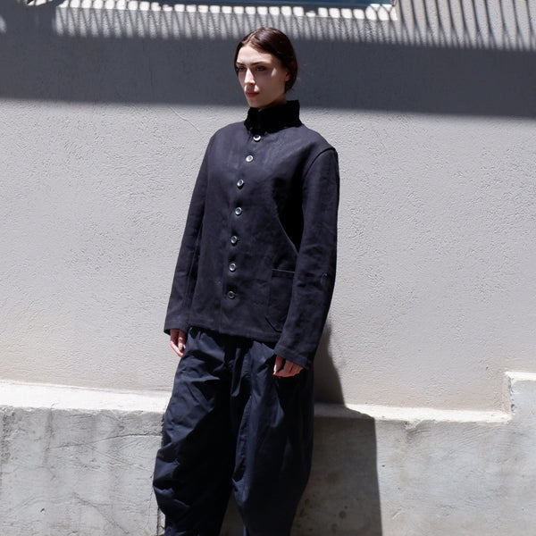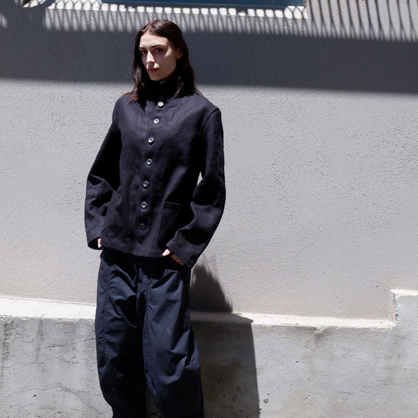 The Medic Jacket plays with the classically uniform, gathering its structure and uniformality at the back waist, fastening to create a fitted and poised unisex silhouette. Constructed using a lightweight 100% linen, the jacket wears easily across seasons and can be layered with both casual and formal undergarments. Features metal buttons to fasten along the centre front, a back slit and gather to allow for slightly flared waist, two box pockets on either side of the garment and a high collar or optional open lapel.